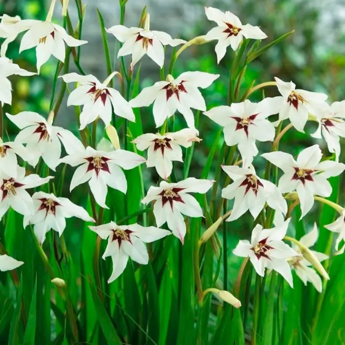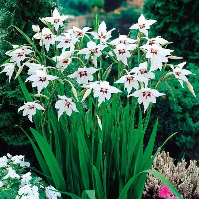 Acidanthera Murielae. Изящный многолетник с крупными белыми цветками на длинных тонких цветоносах. Растение высотой около 80-100 см с длинными мечевидными листьями до 60 см в длину и крупными цветками до 8 см в диаметре. Заостренные белоснежные лепестки у основания имеют темно-фиолетовое пятно. Цветет ацидантера в конце лета - в начале осени. На одном растении образуется до 10 цветков с приятным сладковатым ароматом. На зиму выкапывают и хранят как гладиолусы.