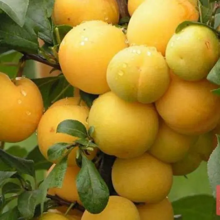 Плоды округлые, ярко-жёлтые костянки до 14 г весом с кисловато-сладкой мякотью, созревают во второй половине августа. Дегустационная оценка 4,1 балла. Косточка хорошо отделяется от мякоти.