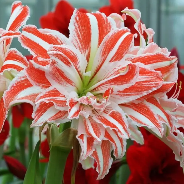 Амариллис Dancing Queen. Разбор 24/26. Восхитительная танцующая королева очаровывает своим видом с первого взгляда. Ее махровые цветочки окрашены в красно-оранжевый цвет с белыми прожилками на каждом лепестке. Цветоносы высотой 40-50 см удерживают на себе 2-4 пышных бутона одновременно. Растение высаживается в горшки и служит украшением комнаты, балкона, террасы, а в теплое время года может расти в открытом грунте на клумбе.