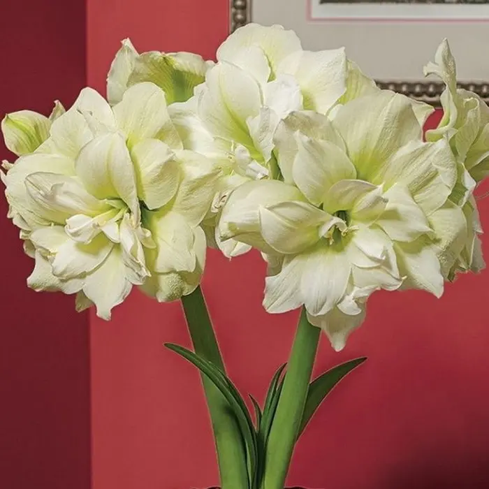 Амариллис Marilyn. Разбор 24/26. Изысканно цветущее многолетнее комнатное луковичное растение высотой 50-70 см с листьями изящной вытянутой формы. Цветонос представляет собой безлистный стебель от 35 до 80 см высотой. На цветоносе развивается 4-6 белых махровых цветков диаметром до 20 см. Зацветает амариллис через месяц-полтора после посадки.