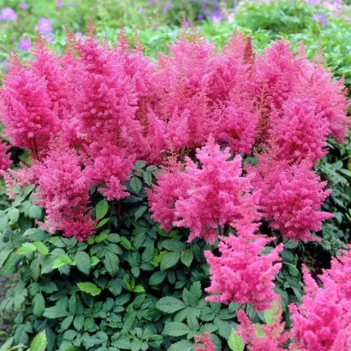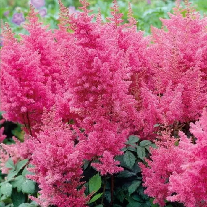 Астильба Арендса Federsee. Высота растения 60 см. Цветет с июля по август. Мелкие цветочки собраны в метельчатые пышные соцветия высотой в 20-25 см и диаметром около 12 см. Период цветения продолжается 2 месяца. Соцветия карминно-розового оттенка имеют едва заметный тонкий аромат.