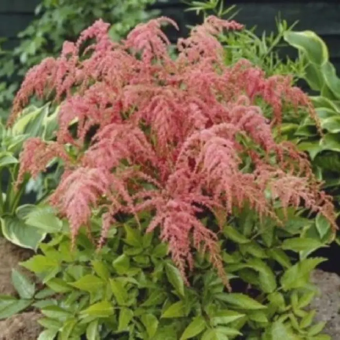 Соцветия - красивые ажурные метелки, слегка ниспадающей формы насыщенного розово-кораллового цвета. Время цветения - июль.