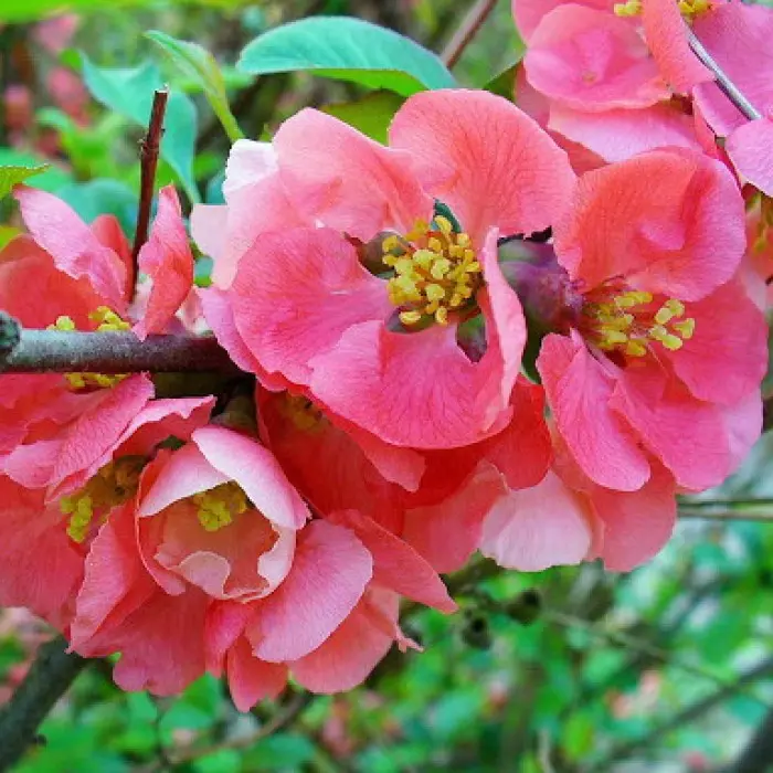 Айва (Хеномелес) средняя Pink Trail. Хеномелес средний или айва средняя – прекрасное весеннецветущее растение. Сорт ‘Pink Trail’ (перевод. как «Розовая тропа») не исключение. Он имеет великолепные цветы большого размера (4.5 см) и лососевого окраса. Они обертывают весь куст в апреле и мае. Гибридного происхождения. Получен в результате скрещивания Chaenomeles speciosa и Chaenomeles japonica.