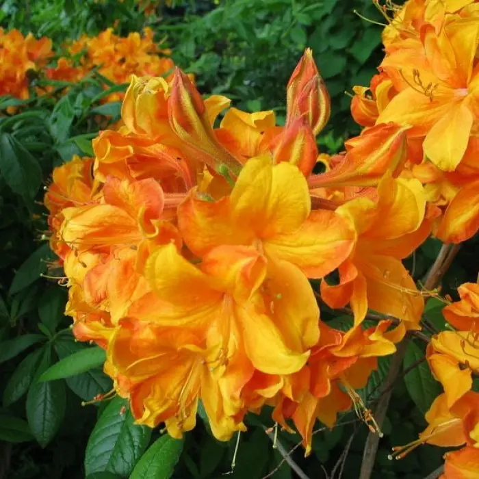 Азалия Klondyke. Высота и ширина 1,5-2 м. Бутоны оранжевые, после распускания золотисто-желтые, крупные, в форме колокольчика или чаши, ароматные. При распускании бронзовые, затем темно-зеленые, осенью изначально малиново-красные, затем оранжево-желтые.