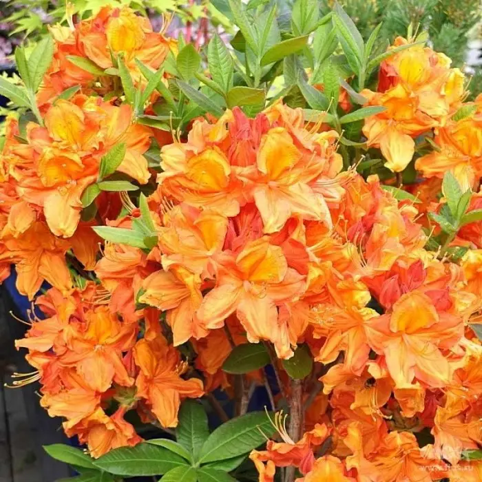 Азалия Glowing Embers. В высоту достигает 1,2 м, разрастаясь в диаметре до 1 м. Форма кроны омпактная, полушаровидная, густоветвистая. Листья заостренные, мягкие, опушенные, ярко-зеленые. Цветет одновременно с распусканием листьев. Цветки крупные, собраны в шаровидные соцветия из 8-10 цветков. Венчик воронковидный, до 6 см в диаметре, оранжевого цвета с кирпичным оттенком. Цветение в мае в течение 2-3 недель.