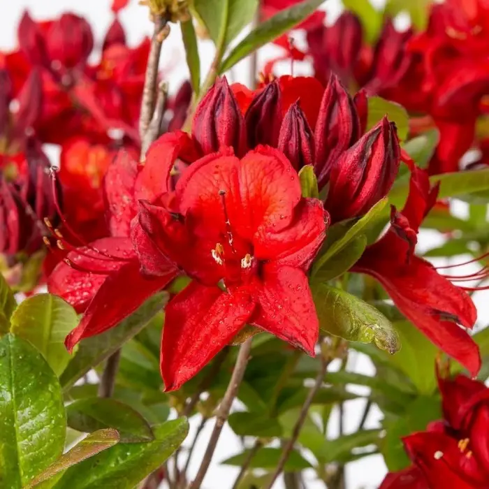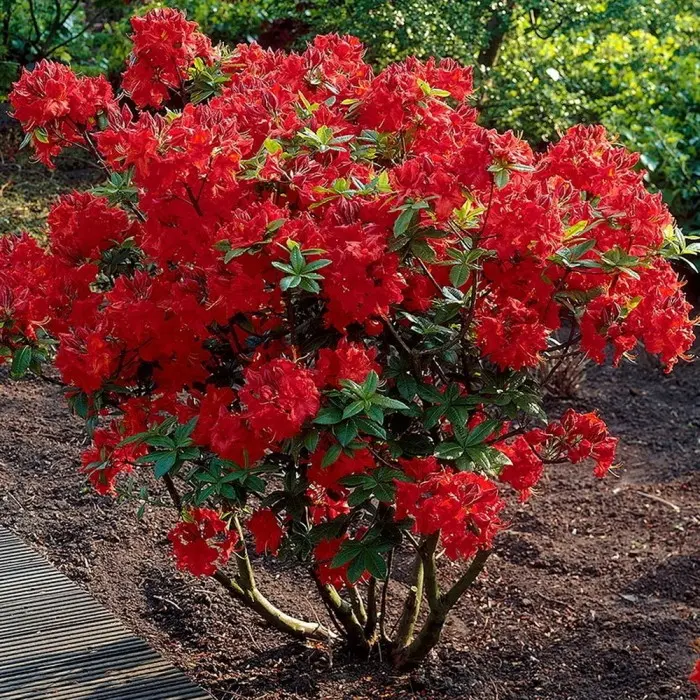 Азалия листопадная Nabucco. Пряморастущий, листопадный кустарник. Очень быстрорастущий сорт. Достигает 180 см высоты и 120 см ширины. Цветы огненно-красные, широко открытые, имеют легкий аромат. Цветение конец мая – июнь. Цветки 6-8 см, собранные в кисти по 8 шт. Сорт очень декоративный.