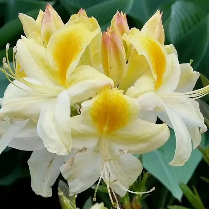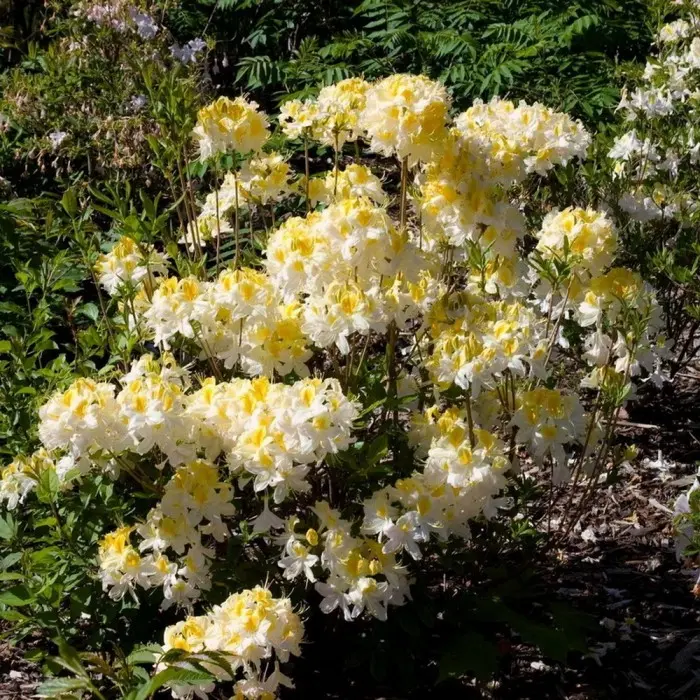 Азалия листопадная Northern Hi-Lights. Листопадный кустарник с густой раскидистой кроной. Листья обратно-яйцевидные с острой верхушкой и клиновидным основанием, 6-7 см длиной, опушенные. Цветок трубчатый, воронковидный, 3-4 см в диаметре, душистый, бледно-желтый с ярким оранжевым пятном. Шарообразные соцветия имеют 7-10 цветков. Период цветения: конец мая-начало июня. Высота взрослого растения: 0,9 м.