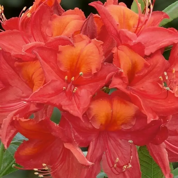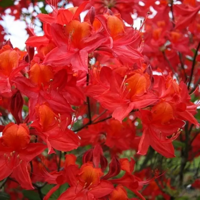 Азалия Tunis. Листопадная азалия. Цветки эффектные воронковидные тёмно-красные с ярко выраженным оранжевым пятном на верхнем лепестке, собраны в соцветия по 6-12 цветков на концах ветвей. Аромат лёгкий. Цветёт обильно в июне. Листья узкие глянцевые, осенью жёлто-красные. Куст вертикальный, к 10-ти годам высотой 100-150 см. Взрослое растение высотой 180 см, шириной 150 см. Место солнечное. Морозостойкость -29?С.