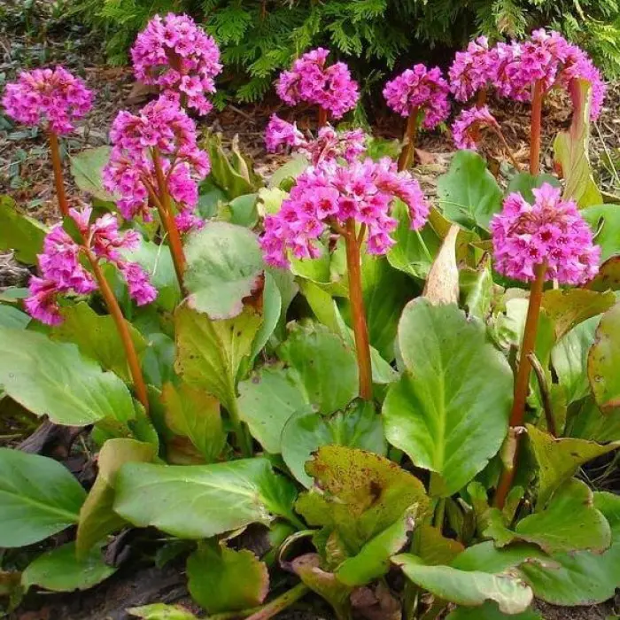 Бадан сердцелистный Purpurea. Высота до 40 см. Листья округло-сердцевидные, темно-зеленые, кожистые, блестящие, зимующие. К осени приобретают огненно-красный цвет. Цветки розово-пурпурные в щитковидных соцветиях. Цветение в конце апреля - мае. Для солнечных, полутенистых и тенистых мест, почвы - любые, дренированные.
