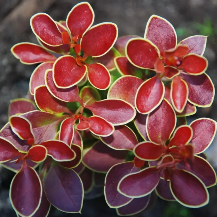 Барбарис тунберга Admiration. Высота 0,3-0,4 м, в благоприятных условиях вырастает до 0,5 м. Крона округлая, но не равномерная, очень плотная, почти сферическая. Рост карликовый. Побеги короткие, коричневые с небольшими иголками. Листочки мелкие, красные с желтой каймой. Цветки желтые с красным оттенком. Плоды мелкие, красные.