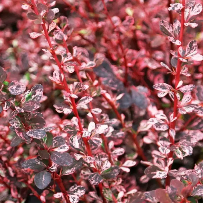 Барбарис тунберга Harlequin. Очень изящный пестрый кустарник с оригинальными пятнистыми листьями.