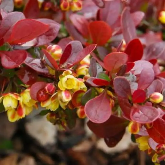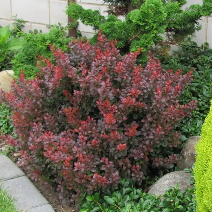 Барбарис тунберга Atropurpurea Nana. Кустарник высотой 0,5-0,8 м, диаметр кроны 0,8-1 м. Крона компактная, подушкообразная. Побеги короткие, прямостоячие или слегка изогнутые, покрыты красно-коричневой корой, почти не имеют шипов. Листья мелкие пурпурные или красно-коричневые, осенью - оранжево-красные. В мае на фоне пурпурных листьев появляются желто-красные цветки, собранные в кисти по 2-5 штук. Плоды - ярко-красные ягоды, созревают в октябре и сохраняются на растении почти всю зиму.