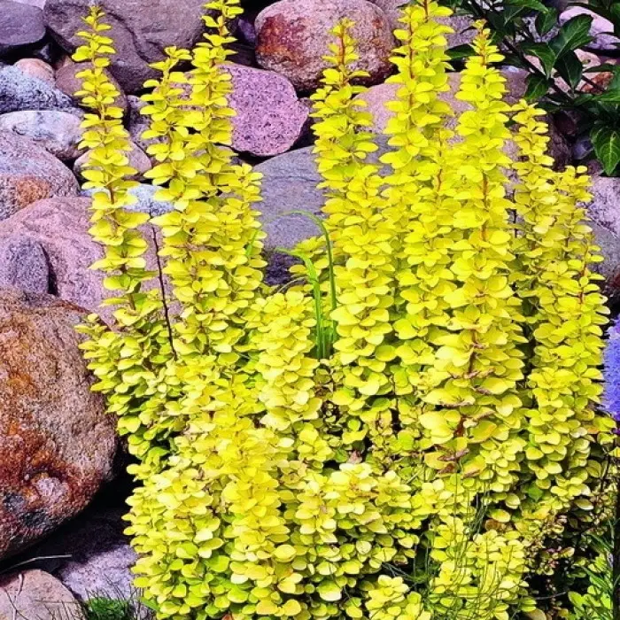 Барбарис тунберга Golden Torch. Отличается колонновидной вертикальной кроной с небольшими годовыми приростами и насыщенно жёлтыми листьями. Побеги прямые; молодой прирост имеет насыщенный оранжево-жёлтый цвет; с шипами.