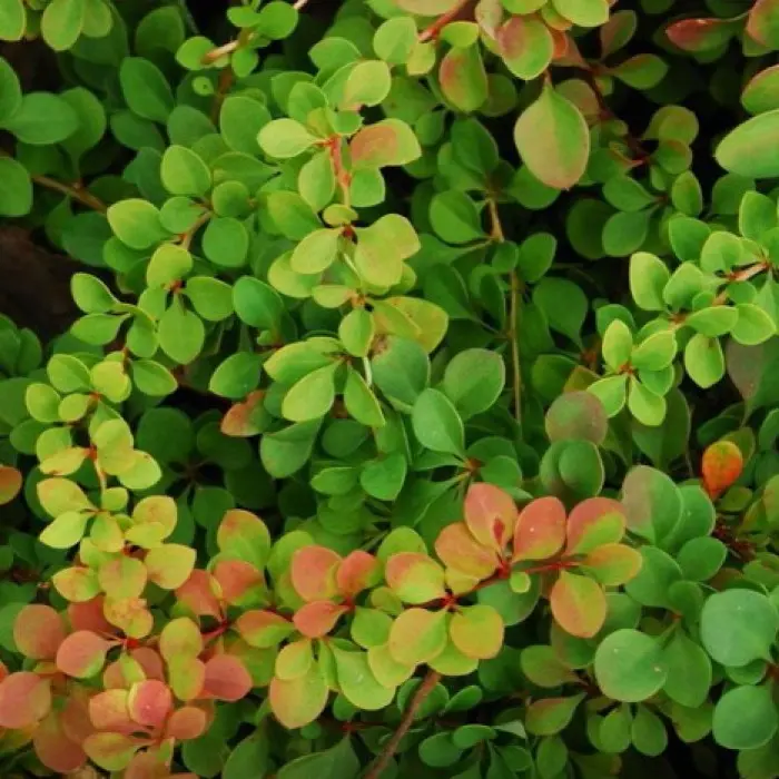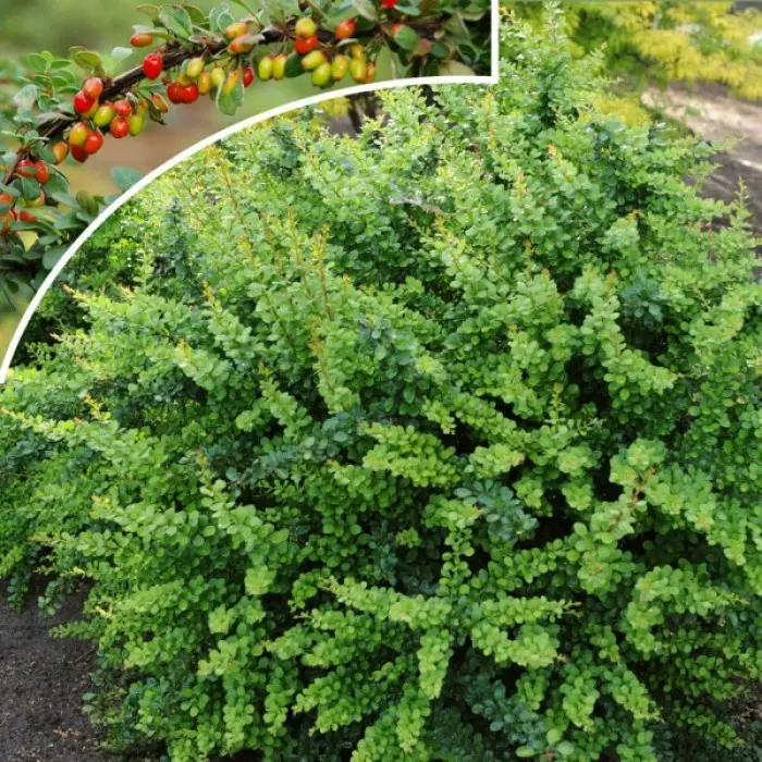 Барбарис тунберга Green Ornament Умеренно растущий колючий кустарник с густой, округлой, компактной кроной высотой и диаметром до 1,5 м. Листья мелкие, изящные, округлые, до эллиптических, длиной до 3 см, при распускании жёлто-зелёные, позднее ярко-зелёные, осенью приобретают красновато-жёлтую окраску.