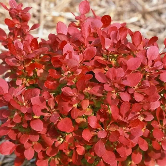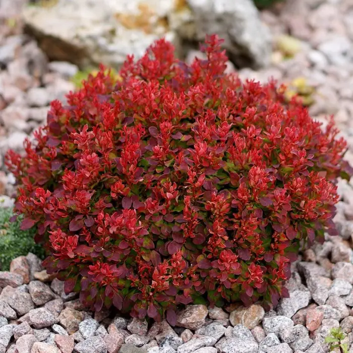 Барбарис тунберга Lutin Rouge. Карликовый барбарис с необычайно яркими алыми листьями. Цвет сохраняется все лето! Обязательным условием является открытое солнечное место посадки, в тени листья зеленеют.