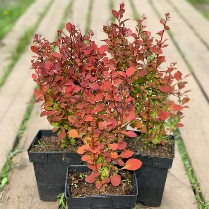 Барбарис тунберга Orange Rocket. Небольшой кустарник с колонновидной формой кроны, достигающий к 10 годам 1,2 м. Окраска молодых побегов – желтовато-оранжевая с розовым оттенком. Листья обратнояйцевидные, слегка сужены к основанию, изящные, небольшие, гладкие, оранжево-красного цвета. Цвет сохраняется с весны до осени, осенью становятся более яркими, ало-красными.