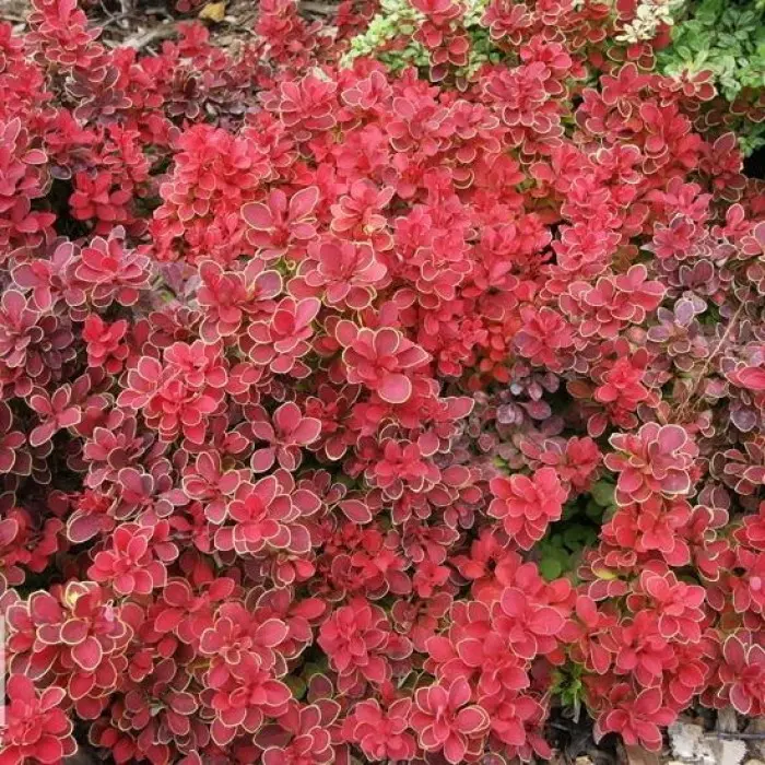 Барбарис тунберга Ruby Star. Очень компактный кустарник шаровидной формы, высотой 30 см и шириной 40 см. Растёт медленно. Цветёт в мае-июне жёлтыми цветками. Плоды красные. Листья овальной формы, карминно-красные с тонкой золотистой каймой по краю, осенью – красные, на солнце более яркие. Рекомендуется высаживать перед кустарниками с тёмно-зелёной листвой. Место солнечное. Почва влажная, дренированная.