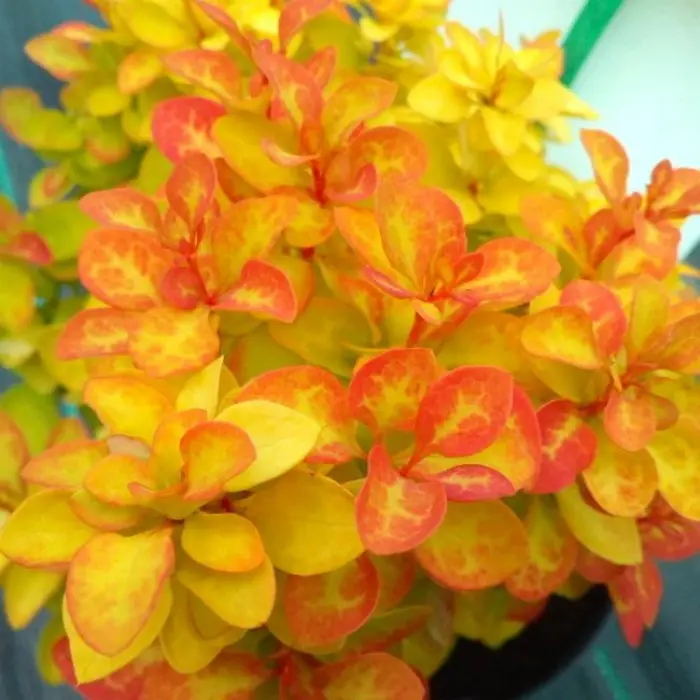 Барбарис тунберга Summer Sunset. Куст колонновидной формы, растёт медленно до высоты 150 см. Молодой прирост оранжевого цвета. Листья очень декоративные, мелкие, круглые, жёлто-зелёные с оранжево-красными краями. Цветёт в мае жёлтыми цветками. Плоды красные. Место солнечное или полутенистое. Почва умеренно влажная, дренированная.