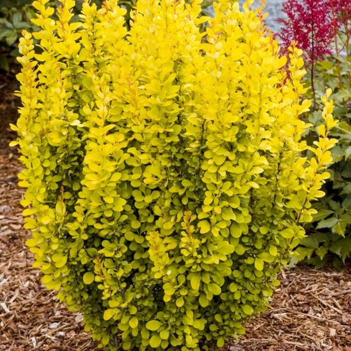 Барбарис тунберга Torch d'or. Вертикально растущий кустарник колонновидной формы, высота 120-150 см, ширина 40 см, побеги коричневые, листья кремово-жёлтые, осенью – красные, цветки жёлтые с красным оттенком, цветёт в мае, место солнечное, к почвам нетребователен, рекомендуется для низких бордюров и композиций в альпийских горках, зона 4 (до -29°С).