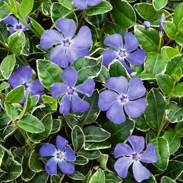 Барвинок малый Ralph Shugert. Вечнозелёный почвопокровный полукустарник. Образует густой ковёр из глянцевых тёмно-зелёных листьев с белыми краями. Высота 10-15 см, ширина 60-90 см. Цветки тёмно-голубые. Цветение обильное, в мае-июне. Хорошо растёт под деревьями, может использоваться для укрепления склонов и как ампельное растение для подпорной стенки. Место полутенистое или тенистое. зона 4 (до -29°С).