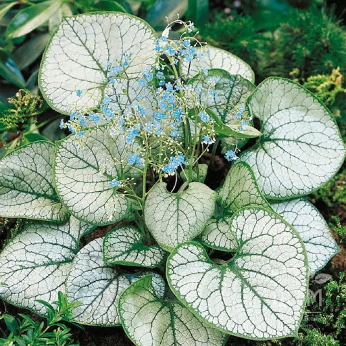 Бруннера крупнолистная Jack Frost. Один из самых любимых садоводами сортов бруннеры. Многолетнее травянистое корневищное растение высотой 40-60 см. Листья бруннеры довольно крупные, сердцевидной формы, морозно-серебристой окраски, с зелеными жилками и краем листовой пластины. Листья слегка опушенные, на длинных стеблях, отходящих непосредственно от корня растения. Цветки брунеры голубые. Имеет довольно продолжительный период цветения начиная с мая по июнь. В полной тени бруннера крупнолистная "Джек Фрост" вытягивается, теряет декоративность, а при выращивании на солнце бруннерам необходимо обеспечить постоянную влажность почвы и воздуха, что возможно лишь при наличии водоема. В более жарком климате высаживать их на открытом солнце не стоит. Зона зимостойкости 4.
