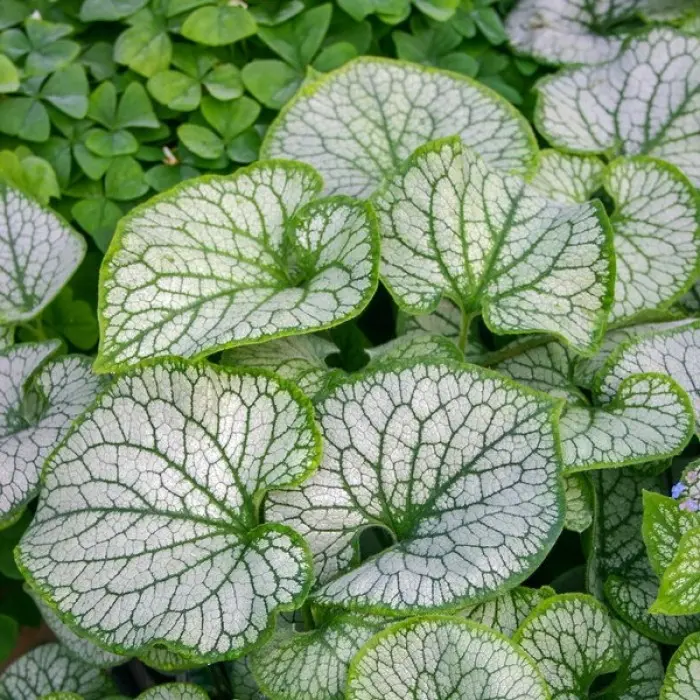 Бруннера крупнолистная Silver Heart. Формирует низкий, высотой 20-30 см кустик, состоящий из крупных и шершавых на ощупь листьев широкосердцевидной формы. Листья серебристого цвета со светло–зелёными жилками и зеленым краем. Цветёт мелкими голубыми цветками, собранные в рыхлые соцветия. Цветоносы высотой 15-20 см. Сроки цветения: конец мая – начало июня. Не даёт самосева. Листья сохраняют декоративность до конца осени. Сорт высокозимостойкий. Лучше всего растёт в полутени.