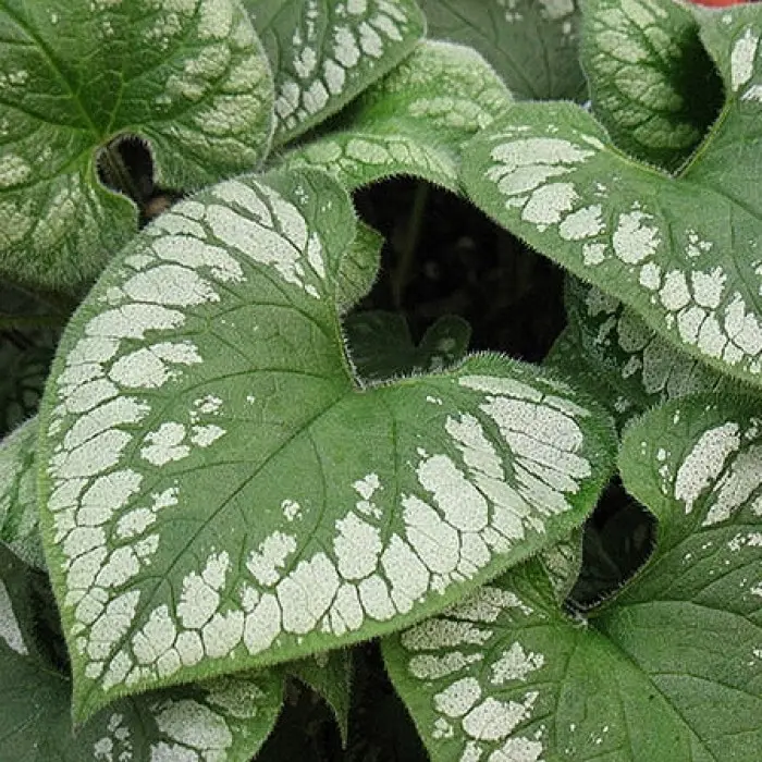 Бруннера крупнолистная Silver Wings. Листья бруннеры насыщенно зеленого цвета с изящной, серебристой паутиной. Цветки небесно-голубого цвета. Цветки мелкие, собраны в соцветия. Не обладает ароматом. Бруннера крупнолистная вырастает 25-35 см в высоту.