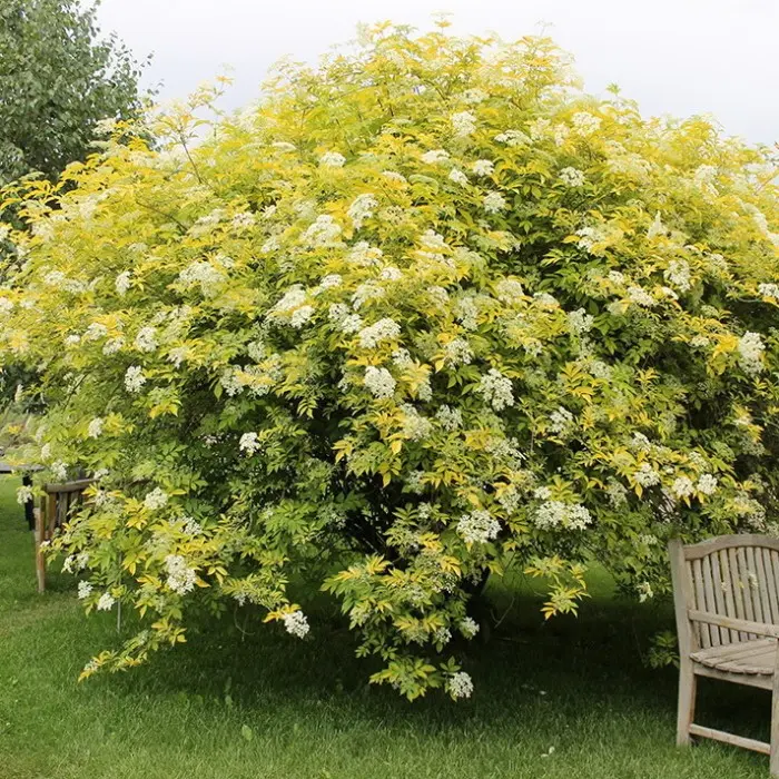 Бузина черная Aurea. Крупный быстрорастущий кустарник или небольшое деревце высотой около 3 м с куполовидной, густооблиственной кроной диаметром до 3 м. Листья крупные, перистые, обычно с пятью овальными зубчатыми листочками, распускаются рано весной. Молодые листья насыщенного желтого цвета, позднее становятся лимонными, зеленовато-желтыми или золотисто-желтыми в зависимости от освещения. Цветет с конца июня в течение месяца. Соцветия крупные, щитковидные, из кремовато-белых душистых мелких цветков. Соцветия расположены по всей кроне.
