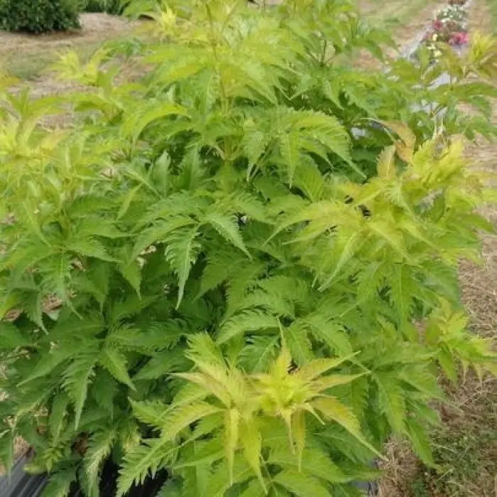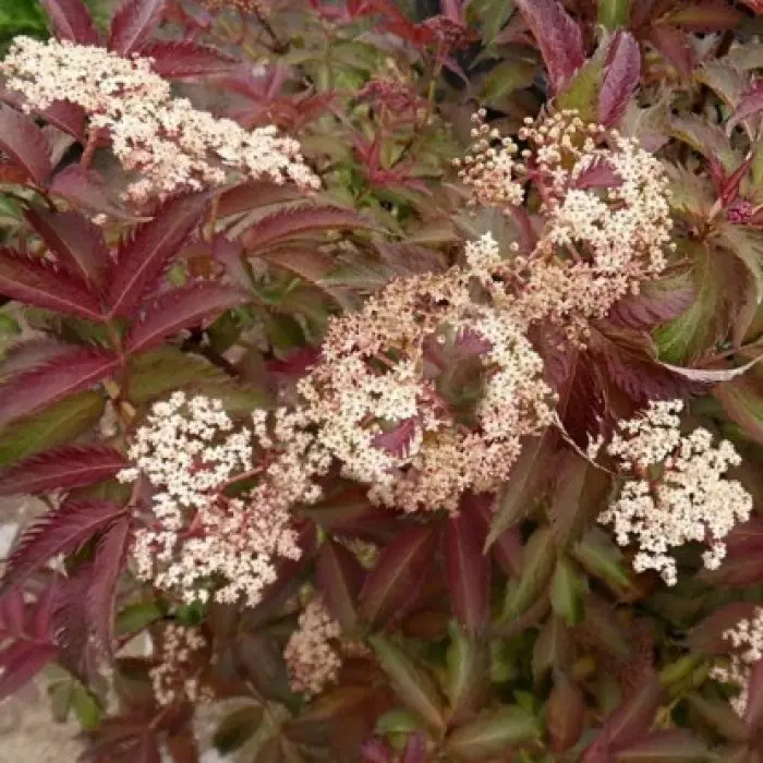 Бузина черная Serenade. Куст компактный, высотой 250 см и шириной 150 см растёт быстро. Молодые весенние побеги розово-красные. Листья зубчатые по краям, в начале лета меняют цвет на жёлто-зелёный, а осенью будут розово-красными. Бутоны розовые. Цветки белые и бледно-розовые, в плоских соцветиях. Аромат сладкий. Цветение в конце мая - начале июня. Плоды мелкие, чёрные, съедобные, очень сочные, созревают в августе-сентябре. Место солнечное. К почве нетребователен. Зона 3 (до -34?С).