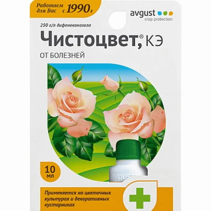 Чистоцвет - это препарат для лечения таких заболеваний как мучнистая роса, серые гнили, пятнистости на цветах (в том числе на розах) и цветочно-декоративных кустарниках. Он обладает высокой эффективностью. Препарат проникает в растения в течение 2-х часов после обработки, а значит - не смывается дождем. Полмесяца Ваши растения будут под защитой.