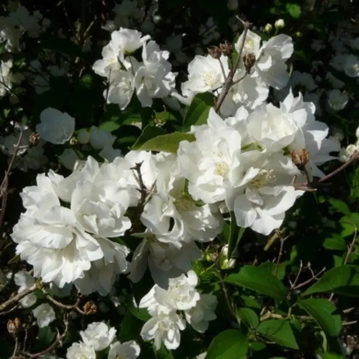 Чубушник Bouquet Blanc. Компактный кустарник с раскидистой кроной, в форме фонтана.