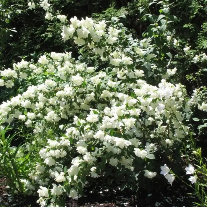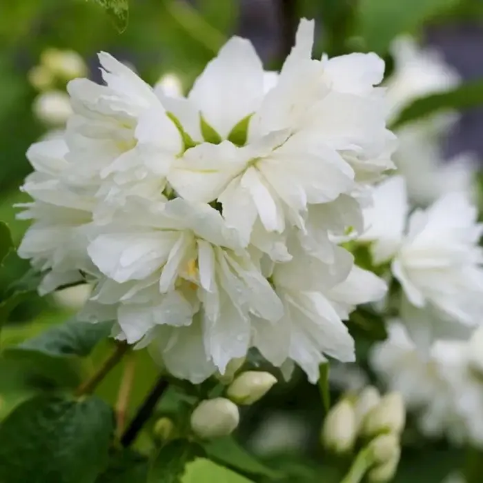 Чубушник Minnesota Snowflake. Махровые белые цветки, распускающиеся поздней весной и сохраняющие свое цветение до середины лета. Высота 2 м. Крона вертикальная, овальная. Листья темно-зеленые. Цветки ароматные, белые, махровые. Венчик состоит из крупных нижних лепестков и тонких, узких серединных лепестков. Цветки собраны в соцветие по 5 штук. Цветет поздней весной и ранним летом.