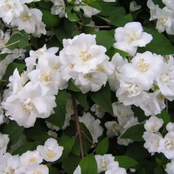 Чубушник Mont Blanc.Невысокий куст до 1 м высотой. Соцветия состоят из 3-5 сближенных цветков, длина соцветия не превышает 3 см. Цветки полумахровые, чисто белые, очень изящного сложения. Лепестки нижнего круга венчика очень широкие, не образующие просветов, распростёртые и красиво отогнутые назад, в очертании образующие квадратной формы цветок до 3,5 см диаметром. Внутренние лепестки немногочисленные, завёрнутые внутрь. Зацветает на 8 дней позже чубушника обыкновенного и цветёт очень продолжительно (в течение 30-40 дней).