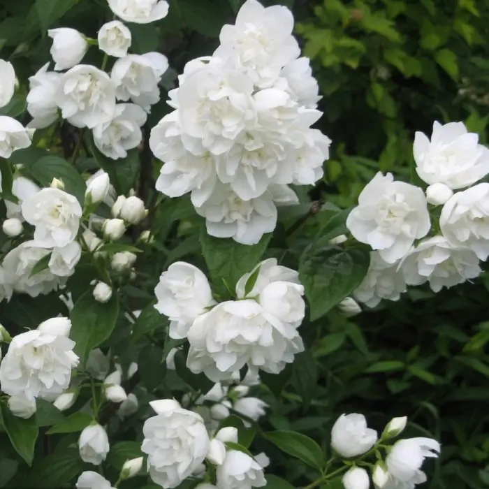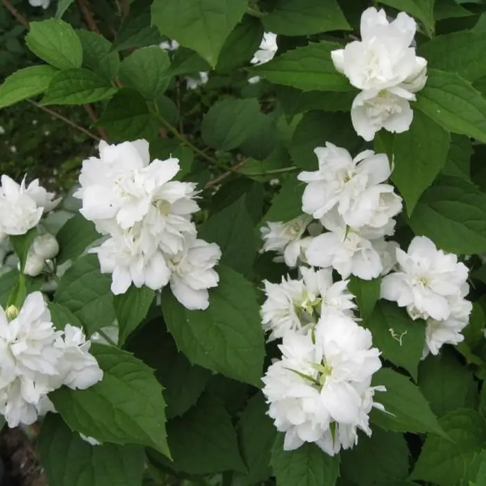 Чубушник Зоя Космодемьянская. Декоративный листопадный кустарник до 3 м высотой. Побеги у чубушника прямые, многочисленные, покрытые тонкой сероватой корой. Листья садового жасмина овальные с редкой зубчатостью по краю, расположены супротивно на коротких черешках, темно-зеленого цвета. Верхняя сторона пластин гладкая, с легким глянцевым блеском, нижняя поверхность матовая и имеет легкое опушение. Взрослый кустарник обладает шаровидной кроной, основание у растения оголенное.