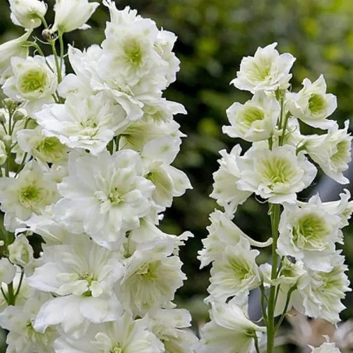 Высота куста до 100 см. Цветки махровые, белые с зеленоватым центром, гофрированные, собраны в плотные кисти. Листья пальчатые, светло-зеленые. Не переносит жарких участков и легких почв. Растения высаживают на расстоянии 60-80 см друг от друга. На одном месте дельфиниумы без деления могут расти до 4 лет, иногда до 8 и больше.