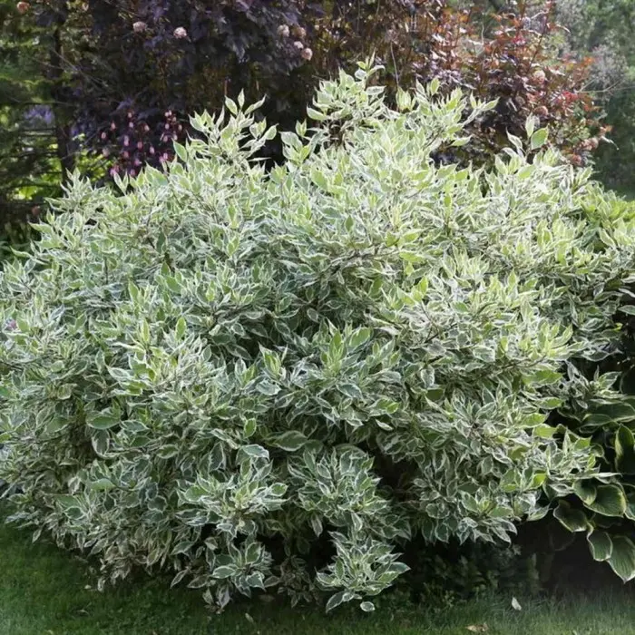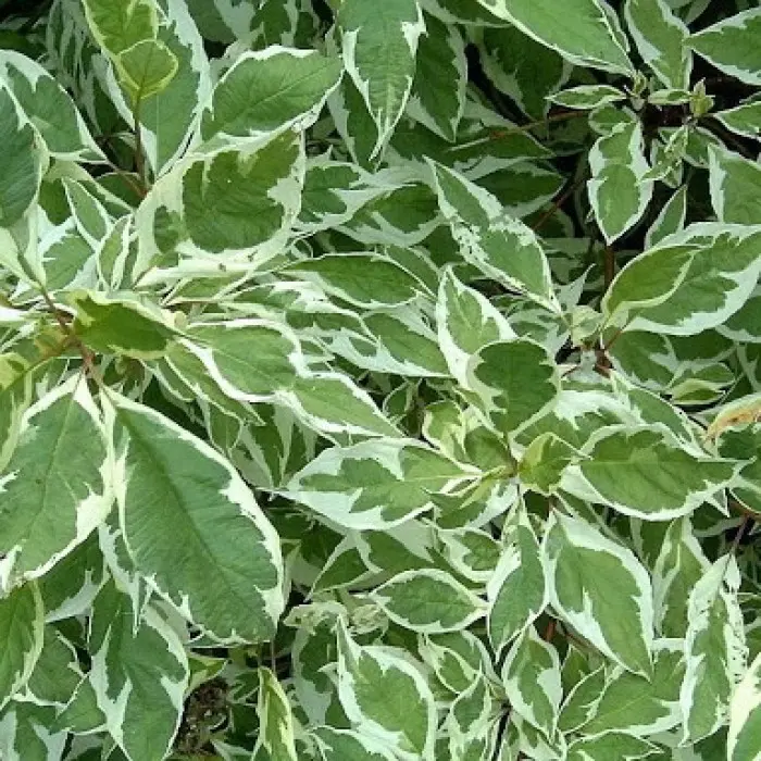 Дерен белый Ivory Halo. Высота 1,2-1,5 м. Крона с вертикально растущими, неразветвленными побегами, компактная. Побеги красно-коричневые или вишневые, имеют красивый, более насыщенный цвет в зимний период. Растет довольно быстро. Листья яркие, зеленые или темно-зеленые с белым окаймлением и мазками, более светлые с нижней стороны. Осенью окрашиваются в пурпурно-красный цвет. Цветет желтоватыми, немногочисленными, мелкими цветками, собранными с щитковидные соцветия. Немногочисленные плоды шаровидные, ягодообразные, поначалу белые, затем приобретают бледно-голубой цвет.