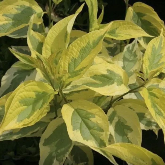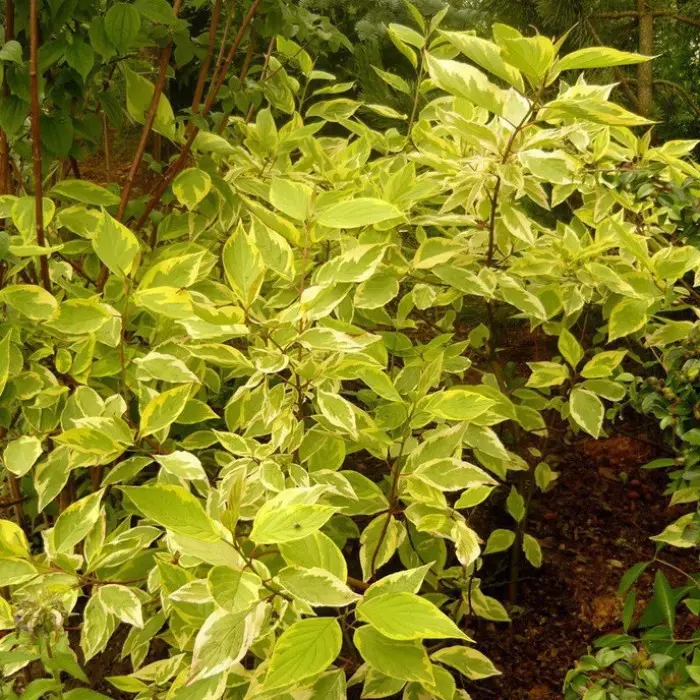 Дерен белый Gouchaultii. Гоучаулти - пышный, раскидистый кустарник, до 3 м высотой и в диаметре. Побеги зимой бордово-красные, ярки, темнее, чем у вида. Листья крупные, зеленые с широкой желтой, мозайчатой каймой. При выращивание на солнце по краю листа появляется еще и красновато-розовая узкая размытая кайма, в полутени эта кайма менее заметна, зато много полностью или наполовину (по жилке) желтых листьев. Мелкие белые цветы собраны в щитковидные соцветия, распускаются в мае-августе, имеют приятный медовый аромат.