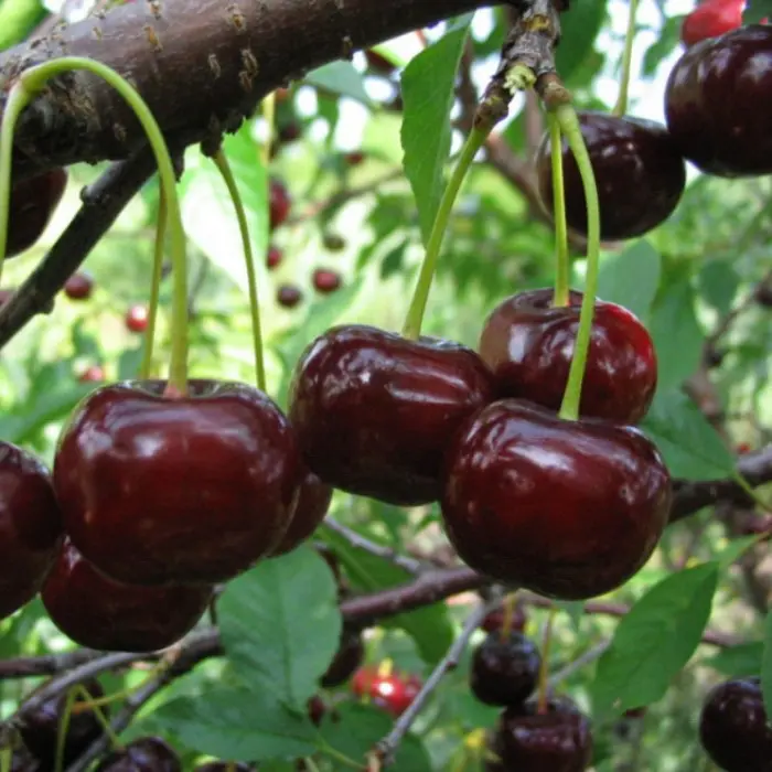 Дюки занимают промежуточное положение между родительскими видами, вишней и черешней, но в целом все-таки ближе к вишне. Листья по величине напоминают листья черешни, но более плотные и с характерным вишневым блеском. Плоды обычно гораздо крупнее, чем у вишни, более сладкие, кислинка – легкая, приятная. Аромат, за который мы любим вишню, у дюков также сохраняется.