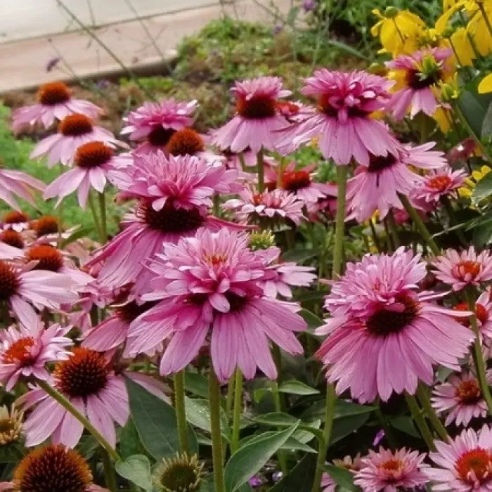Эхинацея Double-Decker. Высота до 80 см. Язычковые цветки розово-пурпурные. На вершине темно-коричневого конуса распускается второй ряд розовых язычковых цветов, поменьше, чем нижний ряд длинных, пурпурно-розовых лепестков. Двурядность развивается не у всех соцветий, даже на одном растении. Цветение начинается в середине лета и продолжается в течение нескольких недель. Это выносливый и несложный в уходе многолетник. Цветы очень привлекательны для бабочек. Отлично подходит для срезки и сухих букетов.