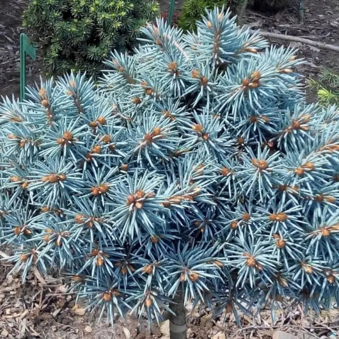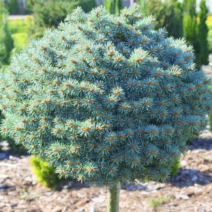 Ель колючая Blue Ball. Ель шаровидной формы. Крона плотная компактная, к 10-ти годам диаметр кроны около 30 см. Годовой прирост 2-3 см. В штамбовой форме высота зависит от места прививки. Хвоя серебристо-голубая. Место солнечное. Почва умеренно влажная, дренированная. Зона 3 (до -34?С). Отличный сорт для небольших приусадебных участков, альпинариев, для выращивания в контейнерах.