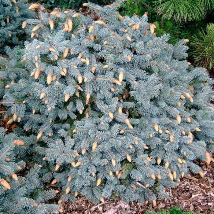 Ель колючая Hermann Naue. Размеры взрослого растения в 10-летнем возрасте достигает 0,4-0,5 м в высоту и 0,5-0,7 м в диаметре. Крона вначале плоскоокруглая, а затем ширококоническая. Ветви короткие, густо разветвлённые горизонтальные, плотно расположенные на стволе.