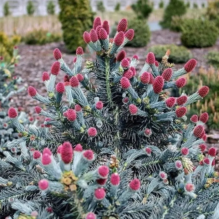 Хвоя серебристо-голубая. Шишки многочисленные, появляются в молодом возрасте, располагаются на концах побегов. Молодые шишки пурпурного цвета, при созревании становятся светло коричневыми.