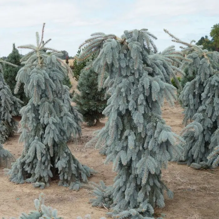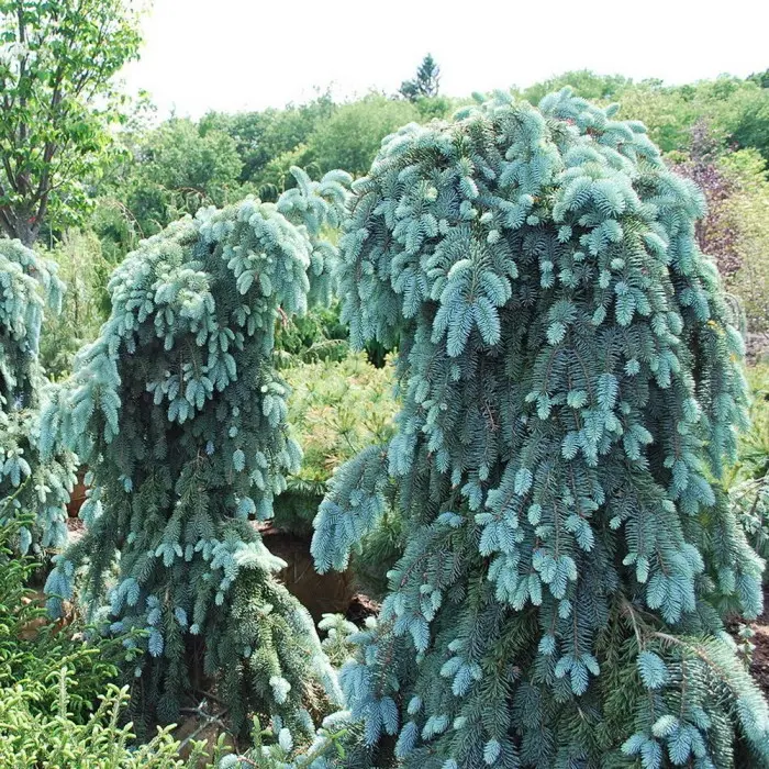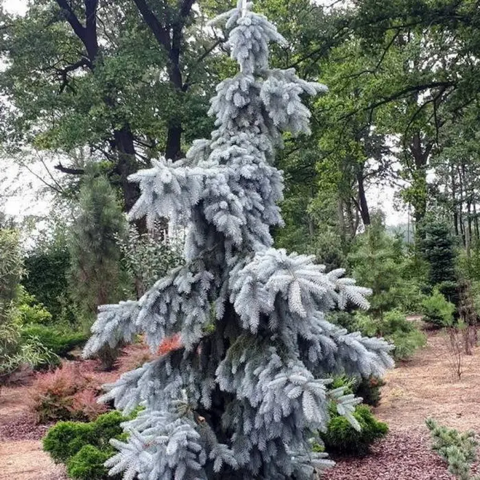 Ель колючая Glauca Pendula. Медленнорастущая форма, к 10-ти годам высота 120-140 см, крона густая. Основной побег с изогнутой макушкой, ветви плакучие, жёсткие, нижние практически лежат на земле, хвоя серебристо-голубая. Рекомендуется для одиночных посадок и каменистых садов. Место солнечное, почва влажная, хорошо дренированная, зона 3 (до -34?С).
