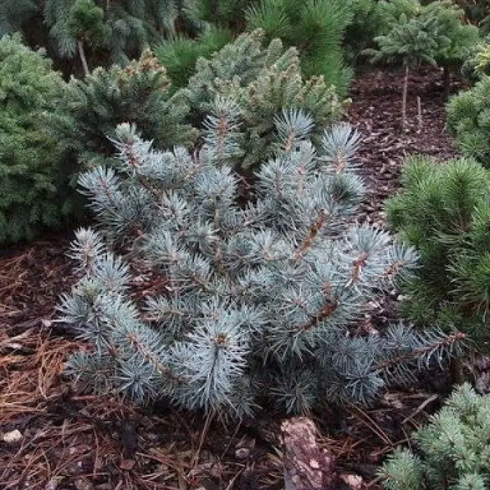 Ель колючая Mecky. Очень необычная карликовая форма, часто имеющая несколько стволов, идеально подходит для культуры бонсай. Ветви густые, нерегулярные. Растёт очень медленно, к 10-ти годам высота 40 см, диаметр 30 см. Хвоя очень жесткая, радиальная, интенсивно серо-голубая. Место солнечное, к почве нетребовательна. Рекомендуется для вересковых и каменистых садов и контейнеров, хорошо поддаётся фигурной стрижке. Зона 3 (до -34С).