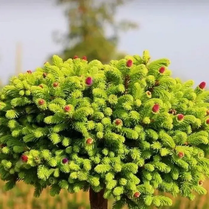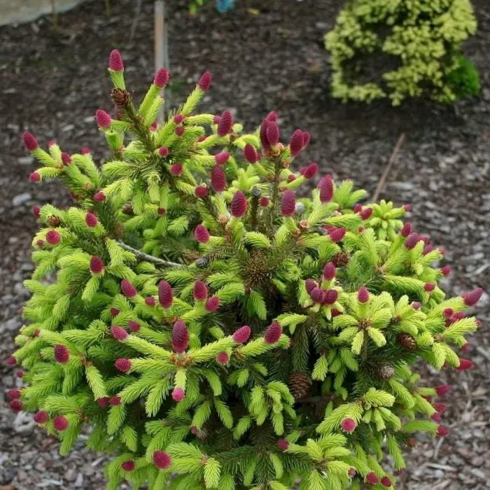 Ель обыкновенная Wild Strawberry. Карликовый, густой, регулярный, плоско-шаровидный сорт. Отличительной особенностью данной вариации являются многочисленные, ярко-красные шишки на концах побегов.