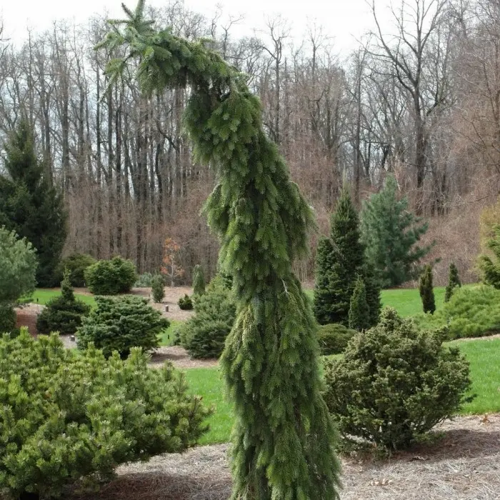 Ель сербская Pendula Bruns. Это очень необычное по форме хвойное дерево с плакучими ветвями, произрастающими до самой земли. Ветви короткие, гибкие, свисающие вдоль ствола, с возрастом образуют плотную колонну. При выращивании растения рекомендуется его подвязывать, для формирования достаточно прямого центрального ствола до высоты не менее 1,5-2,0 м. У основания растения обычно формируется плотная, лежащая на земле юбка. Растение неприхотливо. Высота взрослого растения до 10 м, диаметр кроны до 1-1.5м, растёт медленно, годовой прирост 10 см в высоту и 3 см в ширину. Крона густая, чуть более узкая и более медленно растущая. Хвоя игловидная, тёмно-зелёная, с нижней стороны с двумя широкими светлыми полосами. Шишки мелкие фиолетово-красные, при созревании коричневые, до 6см длиной. Морозостойка. К почвам нетребовательна.