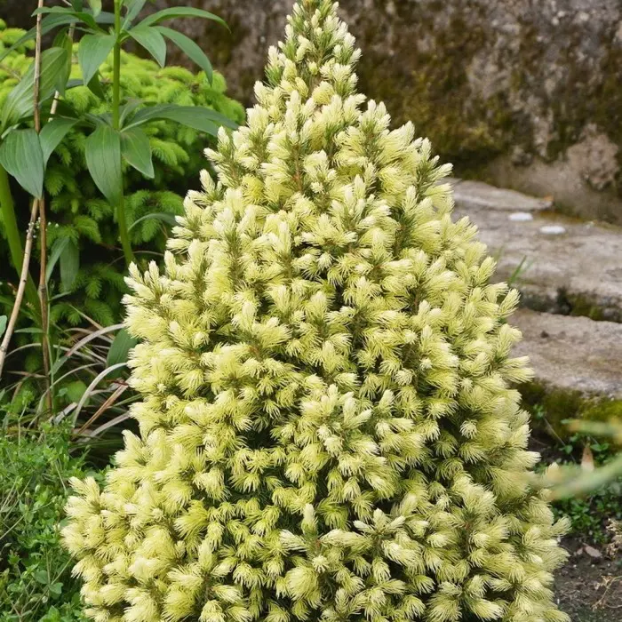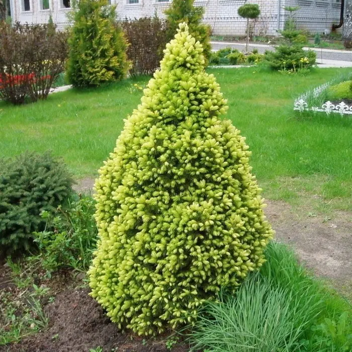 Ель канадская Double Celebration. Ель прекрасной конической формы, очень густой и сжатой. Растёт медленно, через 10 лет высота 80 см и диаметр 50 см. Молодой весенний прирост кремово-жёлтого цвета. Окраска держится до августа, затем снова становится салатово-зелёной с чуть синеватым оттенком. Место солнечное или полутенистое. Почва плодородная, влажная. Не переносит засуху и загрязнённый воздух. Подходит для садов с геометрическими элементами. Нуждается в защите от раннего весеннего солнца. Зона 4 (до -29°С).