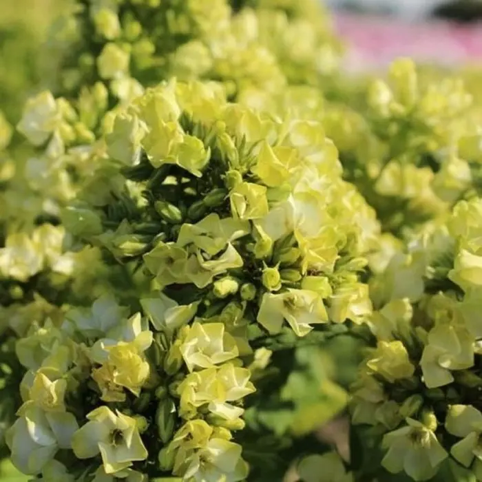 Флокс метельчатый Бабье Лето. Куст компактный, хорошо облиствленный. Стебли прочные прямостоячие, на концах которых образуются соцветия. Середина цветков бело-кремовая, по краям широкая желто-зеленая окантовка. Листья ланцетные, удлиненные, супротивные. Используется для украшения цветников, бордюров, как в одиночных, так и в групповых посадках. Благодаря своей необычной расцветке, эта новинка станет королевой вашего сада. Высота взрослого растения 75 см. Диаметр цветка 4 см. Период цветения июль-август.