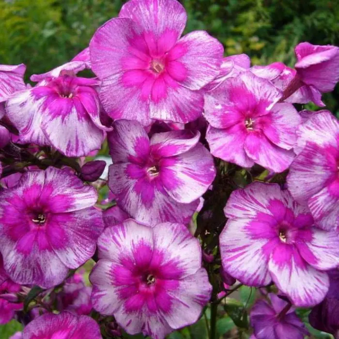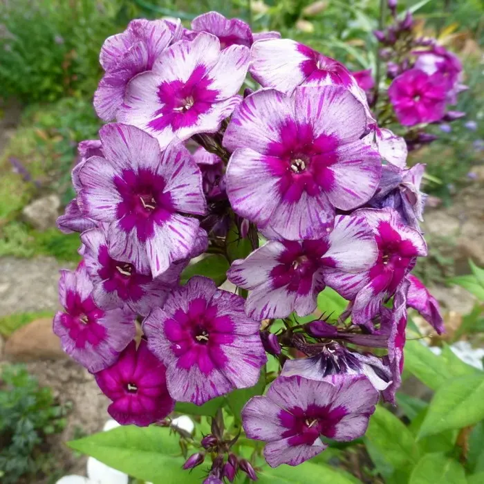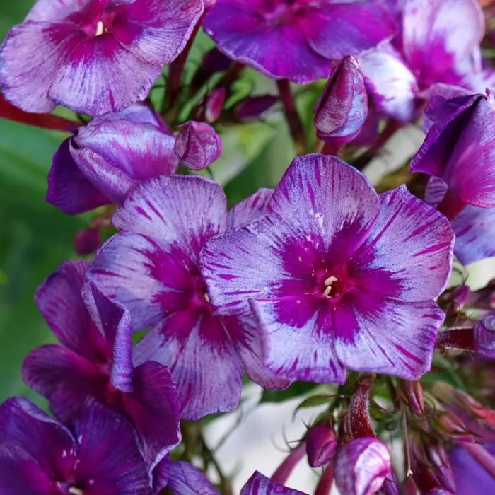 Флокс метельчатый Dragon. Диаметр цветка 4,3 см; высота 80–90 см. Темно-пурпурно-фиолетовый с серебристой дымкой по краю лепестков и ярким пурпурным глазком. Дымка появляется не сразу. Соцветие округло-коническое, рыхловатое. Куст прочный. Зимостойкий, устойчивый. Цветет июль август.