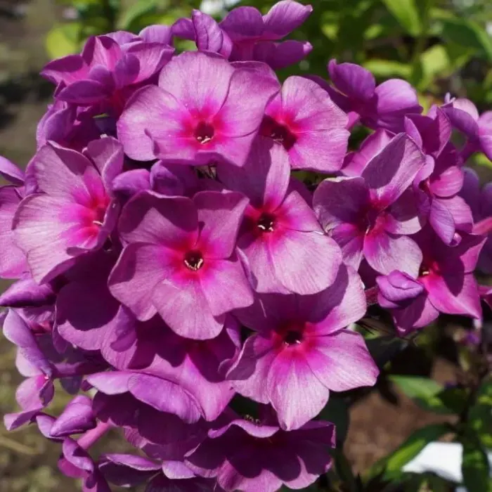 Флокс метельчатый Дымчатое Суфле. Кусты плотные, быстро разрастаются. Цветоносы прямостоячие, прочные, высотой до 1 м. Соцветие эффектное, с переливами окраски, округло-коническое, устойчиво к дождю и ветру. Цветки колесовидные, диаметром около 3,5 см, сиренево-дымчатые со свекольно-сиреневой звездочкой в центре. Цветение в июле – августе.